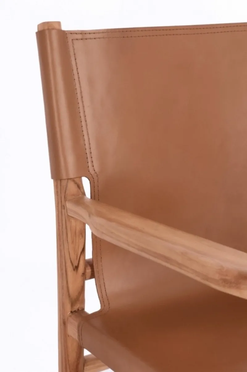 LEGNO TEAK, FINITURA CON VERNICE A BASE D’ACQUA. SEDUTA E SCHIENALE RIVESTITI IN VERA PELLE (PIENO FIORE).
