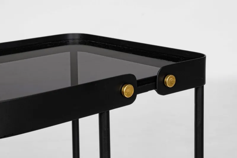 STRUTTURA IN ACCIAIO, VERNICIATA A POLVERE EPOSSIDICA. PIANO IN VETRO TEMPERATO.