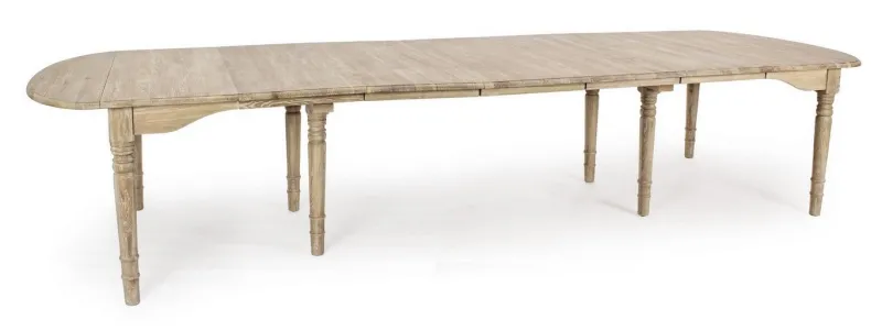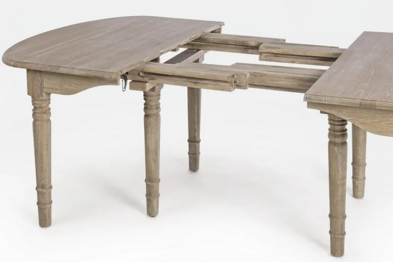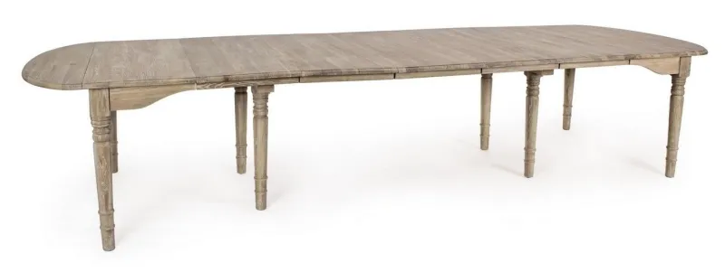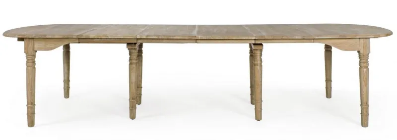LEGNO MASSICCIO DI QUERCIA, VERNICIATURA A BASE D’ACQUA CON FINITURA INVECCHIATA E CERATA. 92X120 COMPLETAMENTE CHIUSO. 152X120 CON LATI OVALI APERTI. 382X120 APERTURA TOTALE. 5 PROLUNGHE DA 46CM ESTERNE . DA ASSEMBLARE.