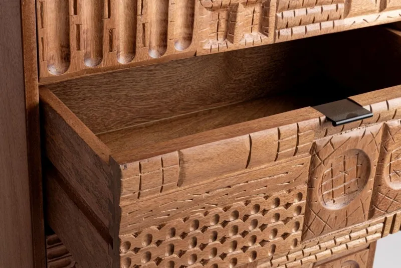 STRUTTURA IN LEGNO MANGO MASSICCIO, SCHIENALE IN MDF. VERNICIATURA A BASE DI NITROCELLULOSA. GAMBE E MANIGLIE IN ACCIAIO. FRONTALE CASSETTI ED ANTE INTARSIATI E LAVORATI A MANO. GAMBE DA ASSEMBLARE.