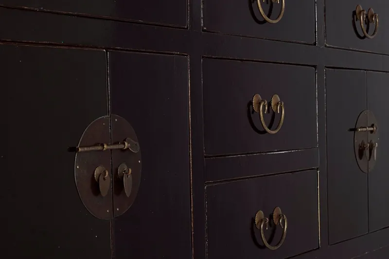 STRUTTURA IN LEGNO DI OLMO RICICLATO RICICLATO. SCHIENALE E PANNELLI INTERNI IN COMPENSATO. FINITURA LUCIDA E PATINATA A BASE D’ACQUA. MANIGLIE IN RAME.