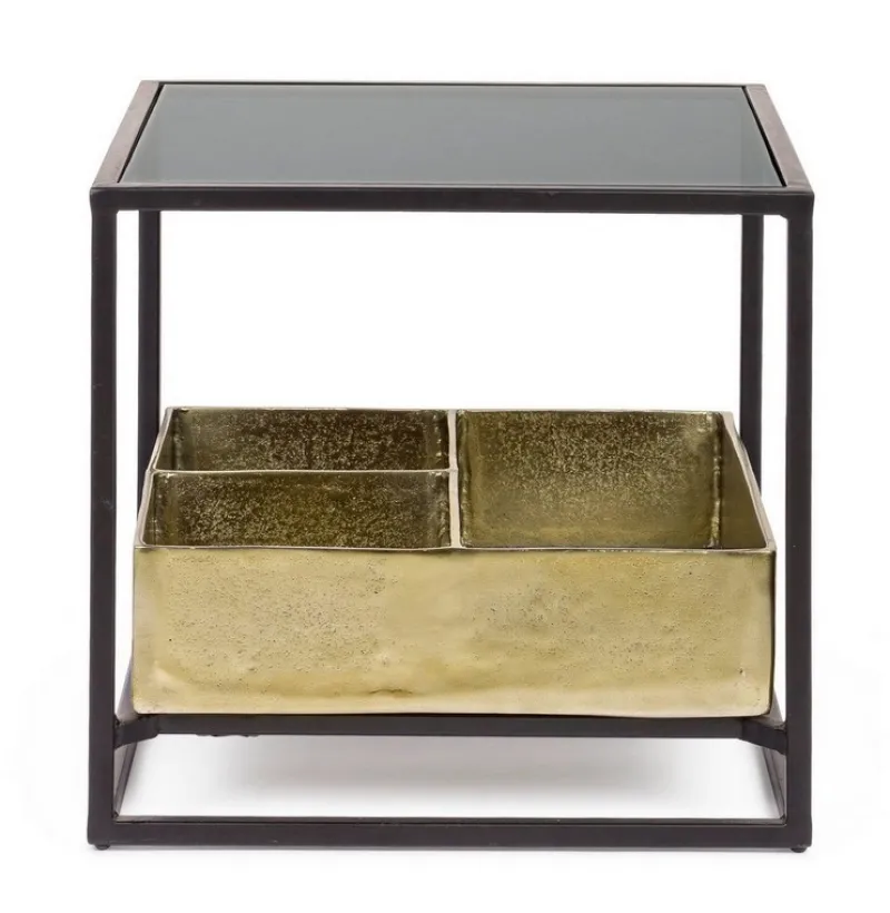 STRUTTURA IN ACCIAIO VERNICIATA A POLVERE EPOSSIDICA. PIANO SUPERIORE IN VETRO TEMPERATO. PIANO INFERIORE CON CONTENITORE IN ALLUMINIO CON FINITURA PLACCATA OTTONE ED ANTICATA.