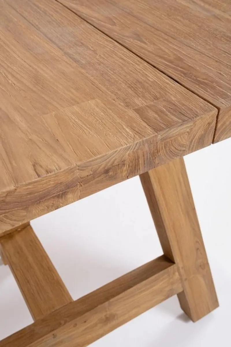 LEGNO TEAK FSC RICICLATO, FINITURA RUSTICA CON VERNICE OPACA A BASE D’ACQUA. DOGHE DEL PIANO (SPESSORE 5CM) IN LEGNO MASSICCIO. VITERIA IN ACCIAIO INOSSIDABILE. IL PRODOTTO IN LEGNO RICICLATO È CARATTERIZZATO DALLA PRESENZA DI TASSELLI IN LEGNO DI DIVERSE SPECIE E COLORE. EVENTUALI FESSURE, CREPE O IMPERFEZIONI, CHE POSSONO