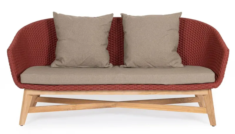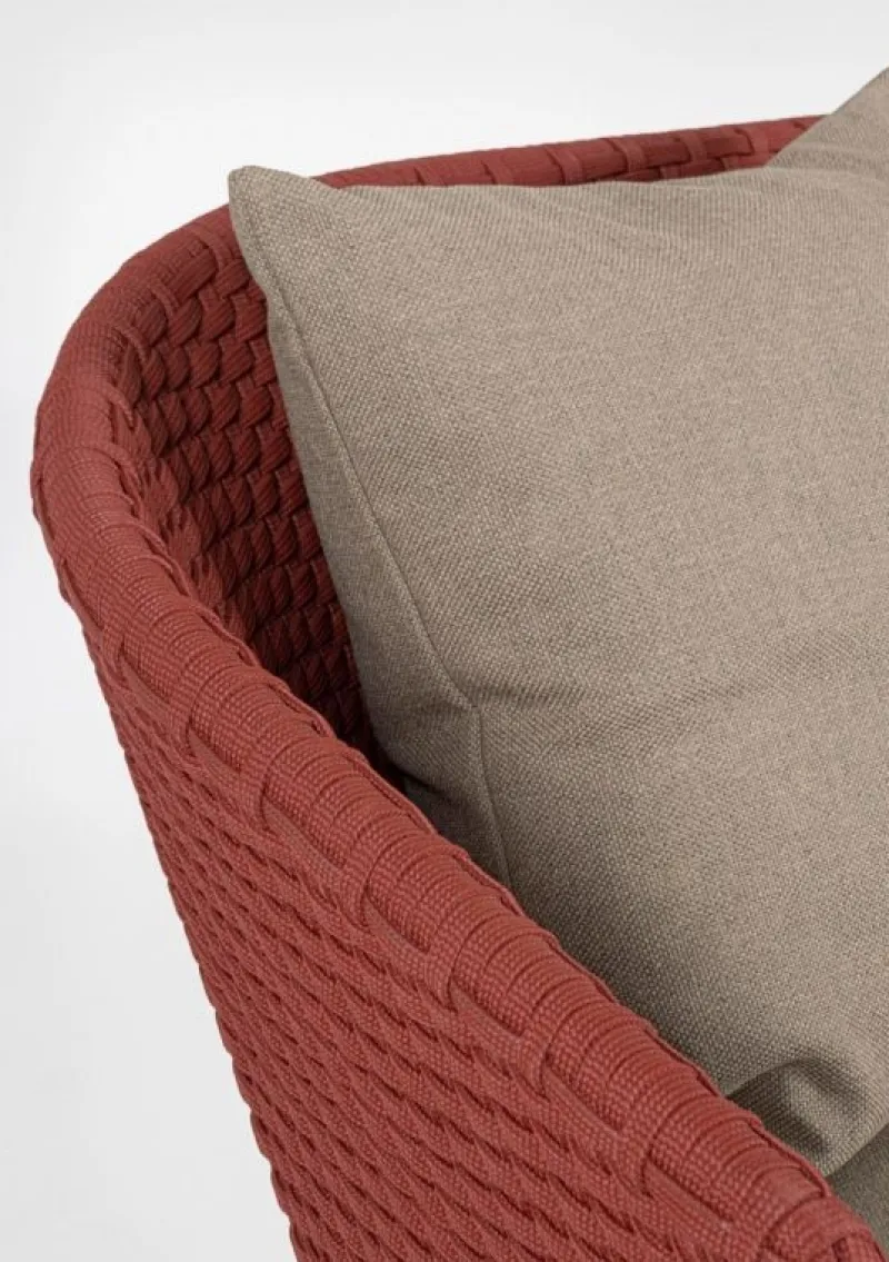 SEDUTA CON STRUTTURA IN ALLUMINIO VERNICIATA A POLVERE (POLIESTERE). INTRECCIO IN CORDA OLEFIN (100% POLIPROPILENE). CUSCINO SEDUTA E SCHIENALE SFODERABILE IN TESSUTO IDROREPELLENTE SUNPROOF OLEFIN (100% POLIPROPILENE). GAMBE IN TEAK – SVLK (LEGNO CERTIFICATO PROVENIENTE DA FORESTE SOSTENIBILI). VITERIA IN ACCIAIO GALVANIZZATO. GAMBE DA ASSEMBLARE. ATTENZIONE: PRIMA DI PROCEDERE AL MONTAGGIO, ASSICURARSI CHE LA NUMERAZIONE SEDUTA-GAMBE COINCIDA.