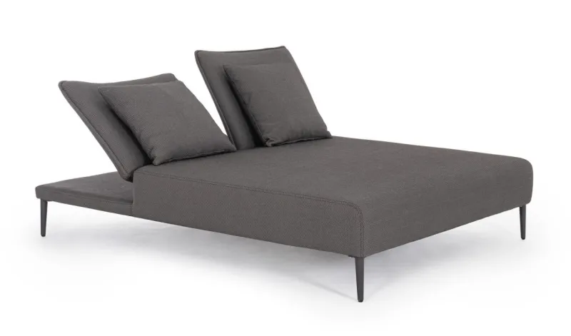 STRUTTURA IN ALLUMINIO. SEDUTA E SCHIENALE (RECLINABILE IN LIBERA POSIZIONE) NON SFODERABILI IN TESSUTO PER ESTERNO IN OLEFIN (100% POLIPROPILENE, 285GR/M2), IDROREPELLENTE E RESISTENTE AI RAGGI UV (GRADO 7), IMPERMEABILIZZATO INTERNAMENTE CON RIVESTIMENTO IN TESSUTO (POLIURETANO). IMBOTTITURA IN SCHIUMA POLIURETANICA, DENSITA’ 40KG/M3. INCLUSO DI