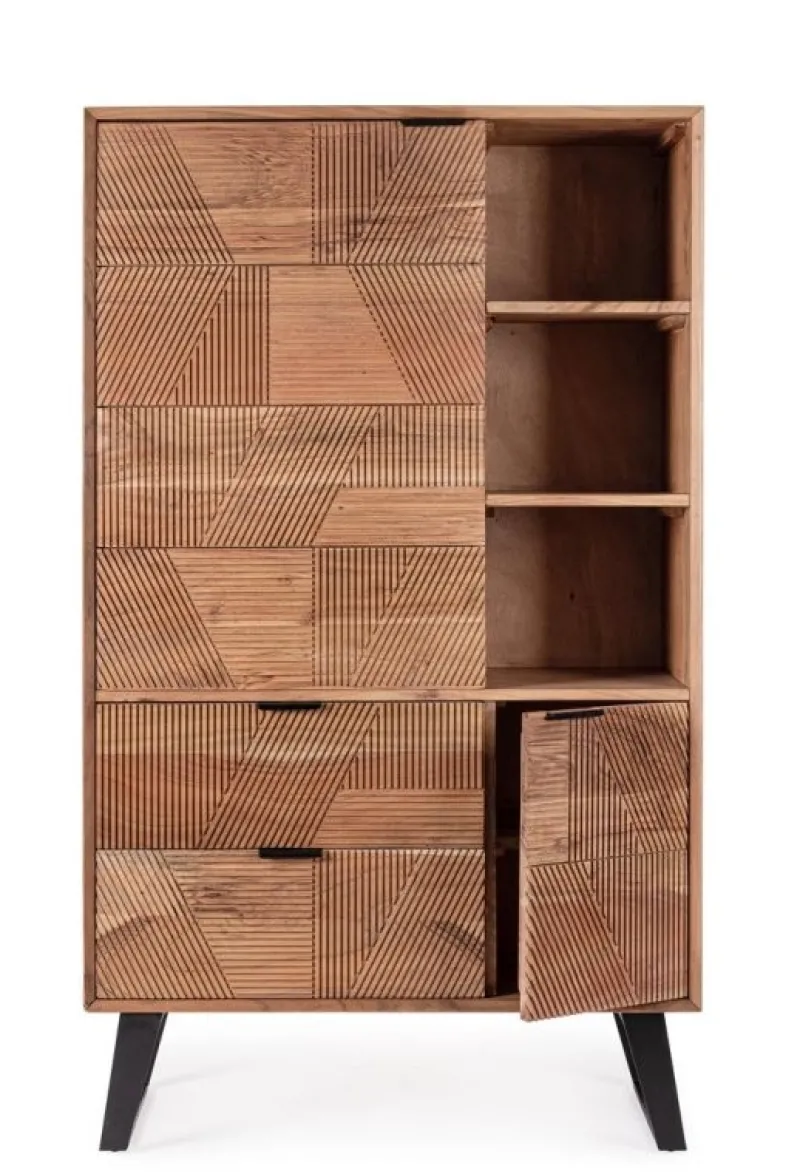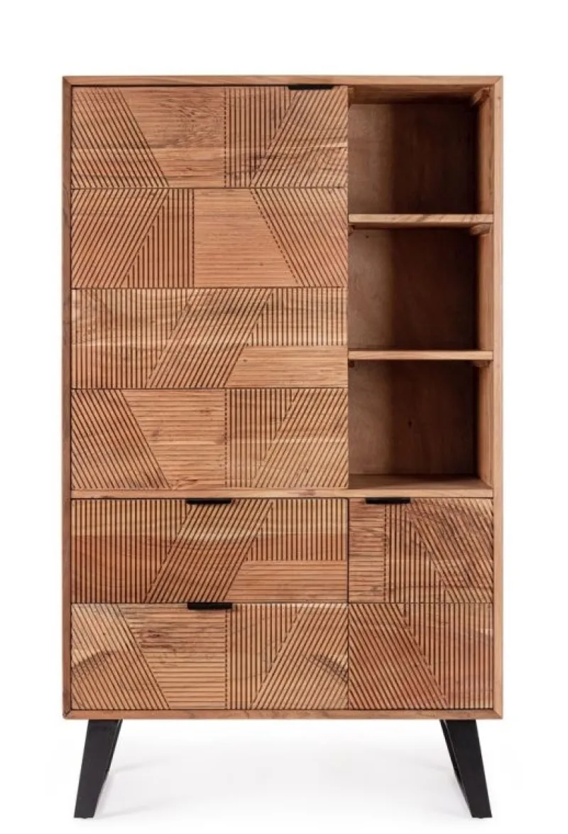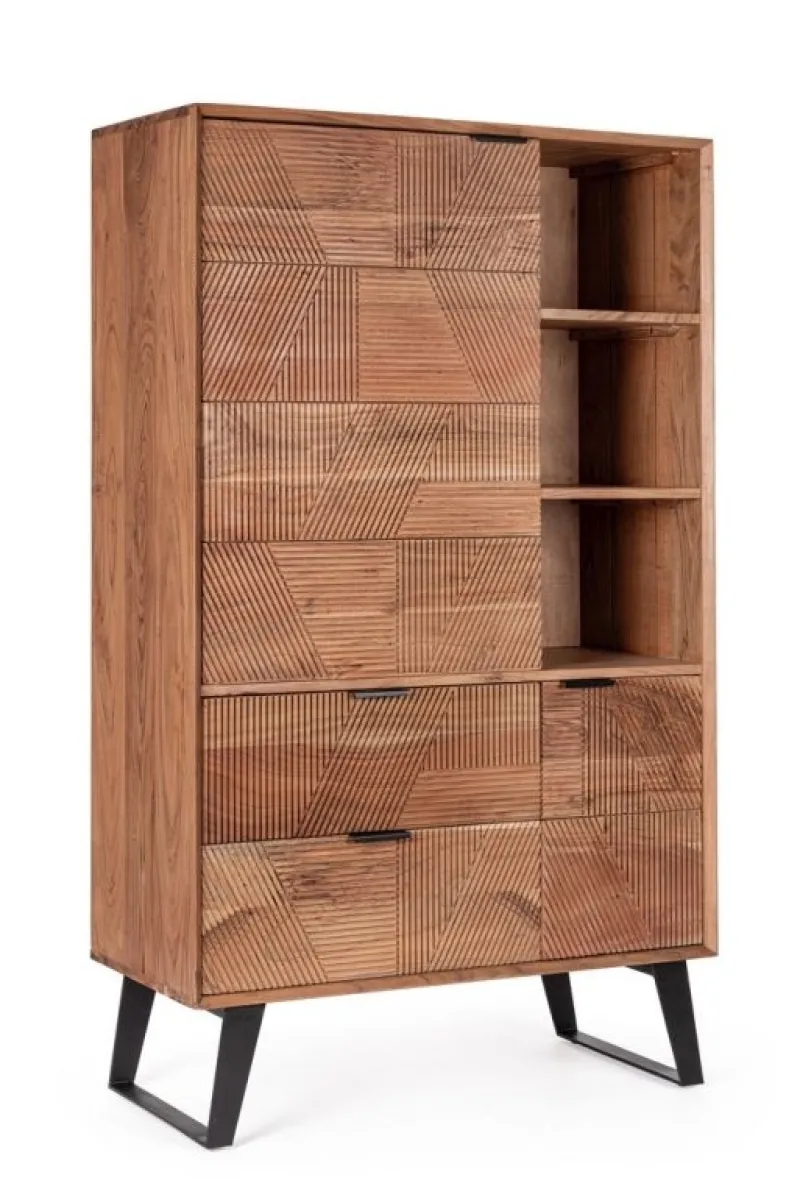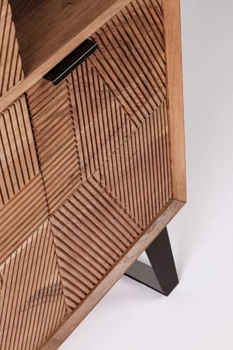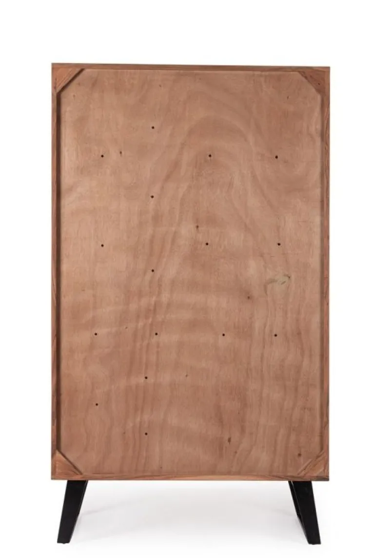 STRUTTURA IN LEGNO DI ACACIA, SCHIENALI E FONDO CASSETTI IN COMPENSATO. FRONTALI ANTE E CASSETTI INTARSIATI E LAVORATI A MANO. FINITURA ACRILICA PROTETTIVA. MANIGLIE E GAMBE IN ACCIAIO. GAMBE DA ASSEMBLARE.