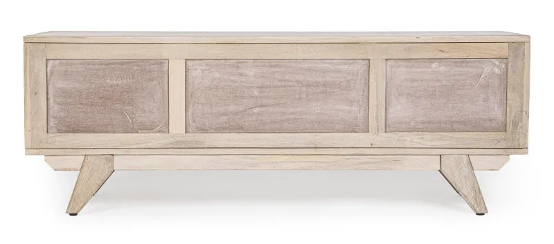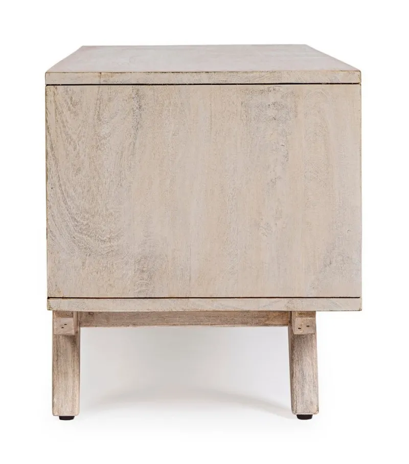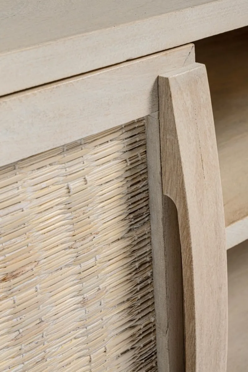 STRUTTURA IN LEGNO DI MANGO, SCHIENALE IN MDF. FRONTALE ANTE IN RATTAN. VERNICIATURA A BASE DI NITROCELLULOSA CON DECAPATURA BIANCA. PIEDINI DA ASSEMBLARE.