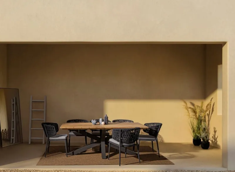 STRUTTURA IN ALLUMINIO VERNICIATO A POLVERE (POLIESTERE). INTRECCIO CON CORDE IN TETORON (100% POLIESTERE). CUSCINO SEDUTA SFODERABILE IN TESSUTO IDROREPELLENTE ACRILICO. IMPILABILE.