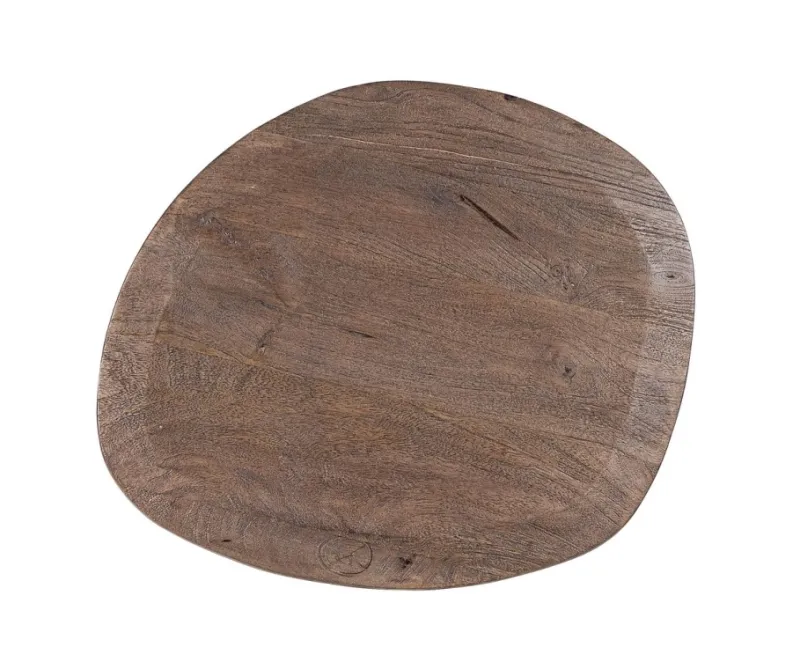 TOP IN LEGNO DI MANGO CON FORMA IRREGOLARE,CON VERNICIATURA A BASE D’ACQUA E FINITURA FINALE A BASE DI NITROCELLULOSA. BASE IN ACCIAIO VERNICIATO A POLVERE EPOSSIDICA EFFETTO MATERICO.BASE DA ASSEMBLARE