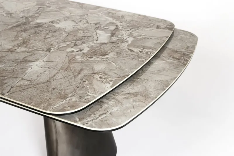 PIANO IN CERAMICA EFFETTO GRIGIO CARNICO LUCIDO E STRATO INFERIORE PIANO IN VETRO TEMPERATO. SUPPORTO PIANO IN ACCIAIO VERNICIATO A POLVERE EPOSSIDICA. GAMBE IN ACCIAIO EFFETTO ARGENTO SCURO SPAZZOLATO. PROLUNGHE INDIPENDENTI. GAMBE DA ASSEMBLARE.