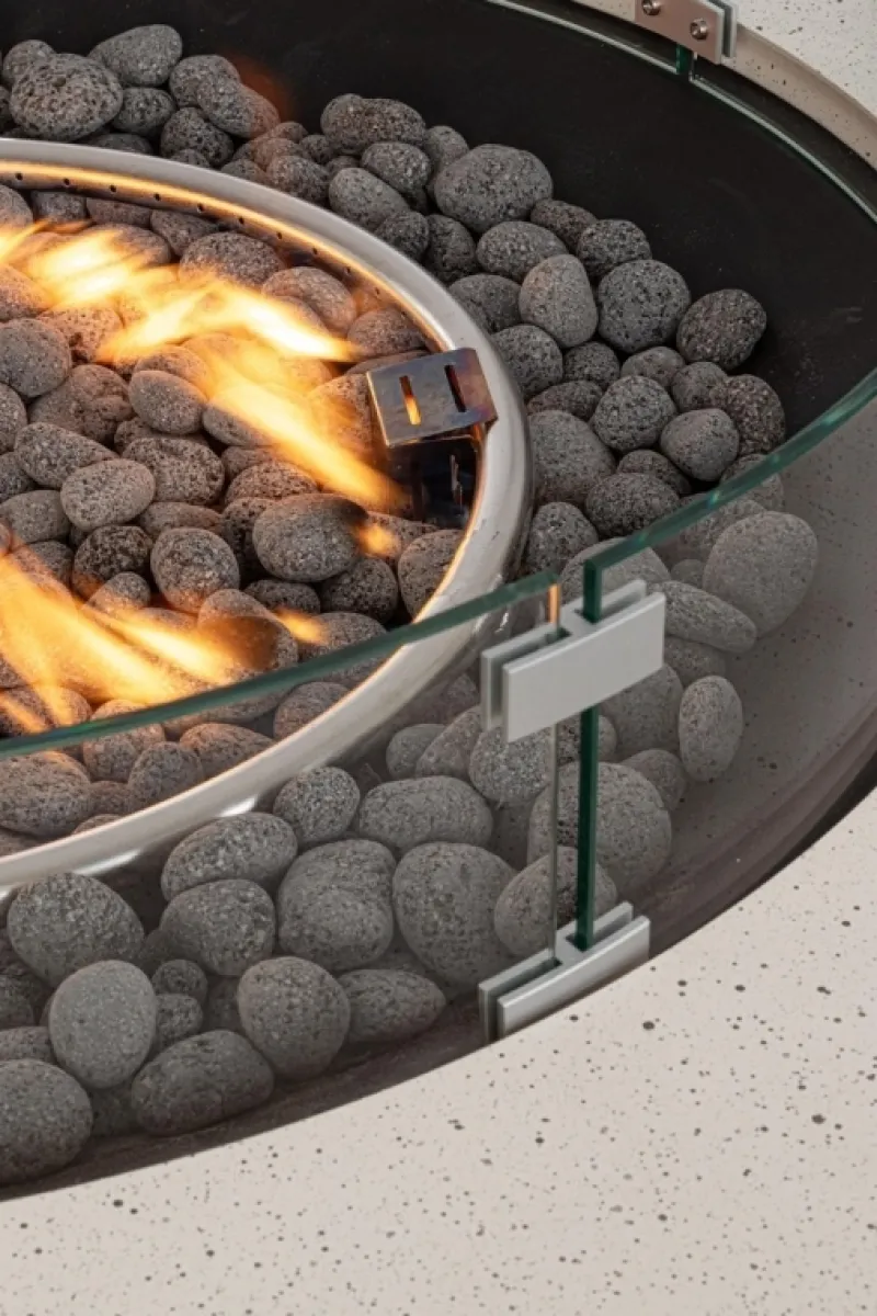 STRUTTURA IN ACCIAIO VERNICIATO (SPESSORE 0,8 MM). PARAVENTO PER CAMINO IN VETRO (SPESSORE 5 MM), VETRO REMOVIBILE. MISURE VETRO Ø74 X 14 CM. BRUCIATORE: Ø45 CM. PROVVISTO DI COPERCHIO IN ACCIAIO VERNICIATO PER COPRIRE L’ARTICOLO QUANDO NON E’ IN USO. COMPLETO DI SASSI DECORATIVI IN ROCCIA LAVICA COLORE GRIGIO SCURO. PROVVISTO DI COPERTURA IN TELO NERO PER COPRIRE