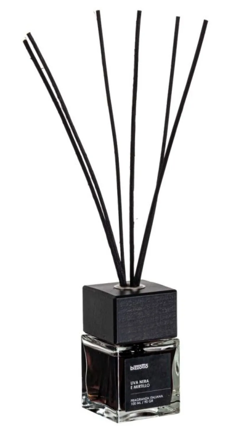UVA NERA E MIRTILLO FRAGRANZA PER AMBIENTI CON 6 BASTONCINI NERI (H 30 CM). PROFUMO APPARTENENTE ALLA FAMIGLIA DEI FRUTTATI. BOTTIGLIA IN VETRO, FORMATO 100 ML. CONTROTAPPO IN PLASTICA E TAPPO DECORATIVO IN LEGNO NERO. AREA DI COPERTURA 20 MQ. LIQUIDO E VAPORI FACILMENTE INFIAMMABILI.