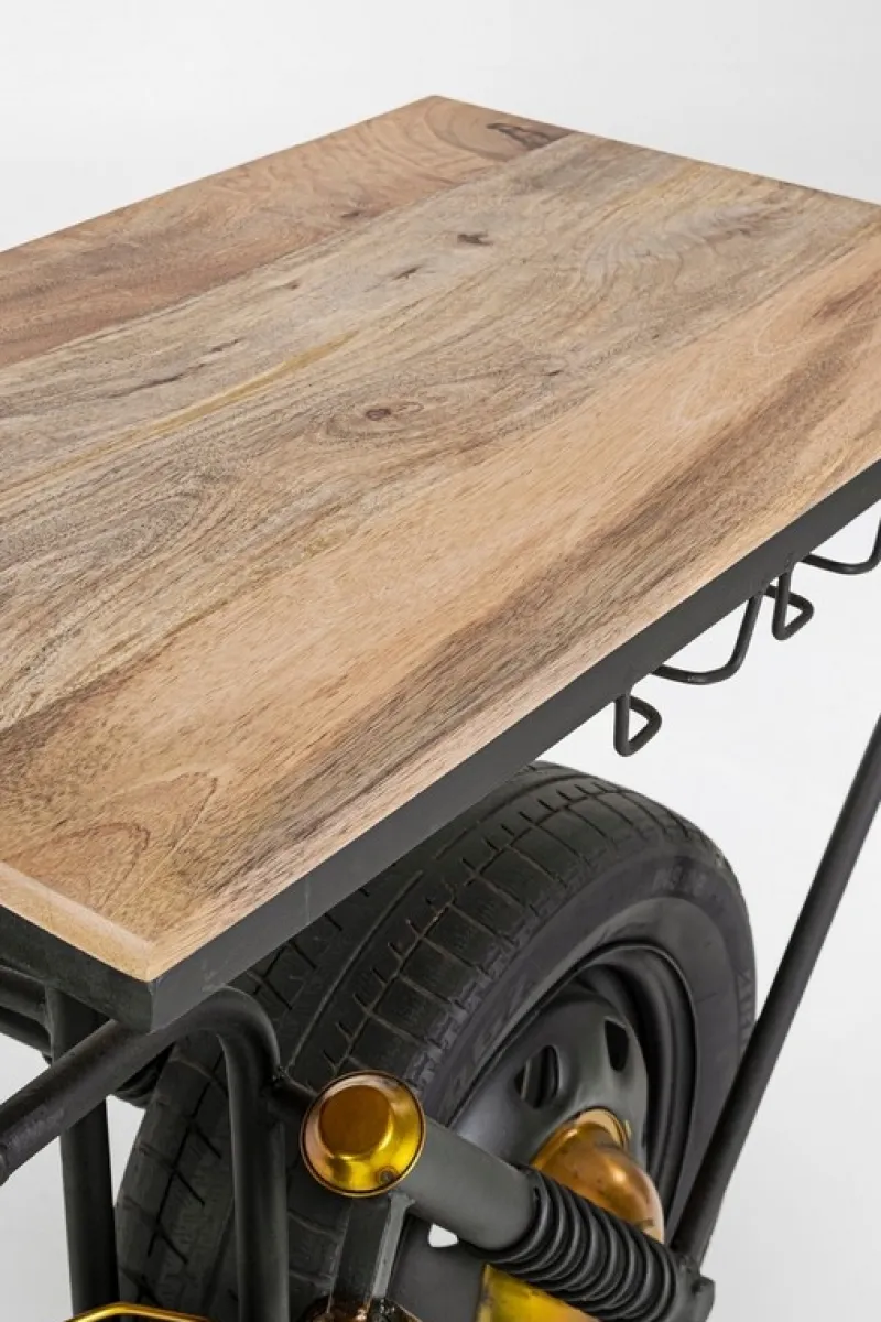 STRUTTURA IN ACCIAIO. PIANO IN LEGNO DI MANGO. COMPRENSIVO DI PORTABOTTIGLIE E PORTABICCHIERI. TRATTANDOSI DI PRODUZIONE ARTIGIANALE OGNI MODELLO PUO’ VARIARE IN PICCOLI PARTICOLARI COSTRUTTIVI. EVENTUALI PICCOLE CREPE O SPACCATURE SONO DA RITENERSI CARATTERISTICHE PROPRIE AL NATURALE LAVORO DI RECUPERO.