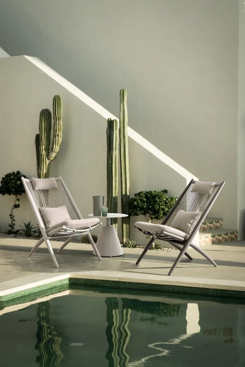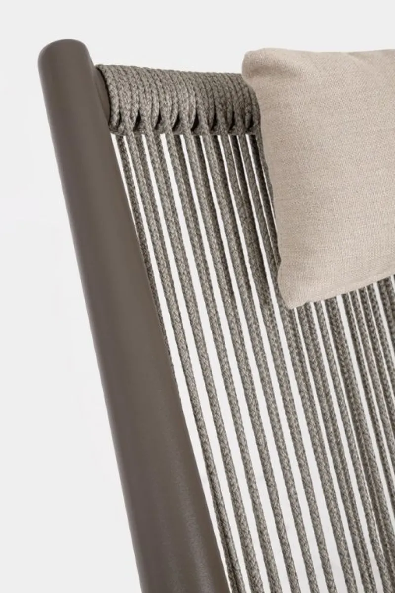 STRUTTURA IN ALLUMINIO VERNICIATO A POLVERE (POLIESTERE), INTRECCIO CON CORDE IN POLIESTERE (IDROREPELLENTI, RESISTENTI RAGGI UV). CUSCINI SFODERABILI IN TESSUTO IDROREPELLENTE ACRILICO (280GR/M2). DA ASSEMBLARE.