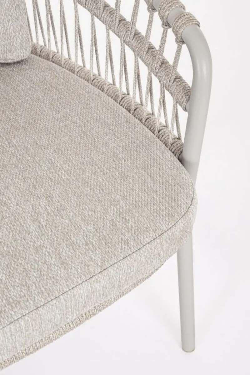 STRUTTURA IN ACCIAIO INOSSIDABILE (201). INTRECCIO PER ESTERNO IN CORDA (POLIPROPILENE). CUSCINI SFODERABILI IN TESSUTO IDROREPELLENTE SUNPROOF OLEFIN (100%POLYPROPYLENE).