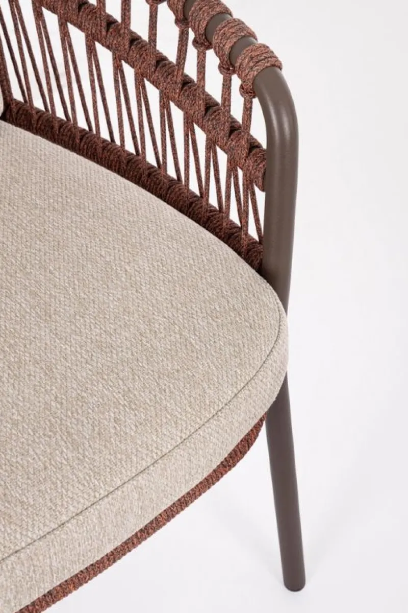 STRUTTURA IN ACCIAIO INOSSIDABILE (201). INTRECCIO PER ESTERNO IN CORDA (POLIPROPILENE). CUSCINI SFODERABILI IN TESSUTO IDROREPELLENTE SUNPROOF OLEFIN (100%POLYPROPYLENE).