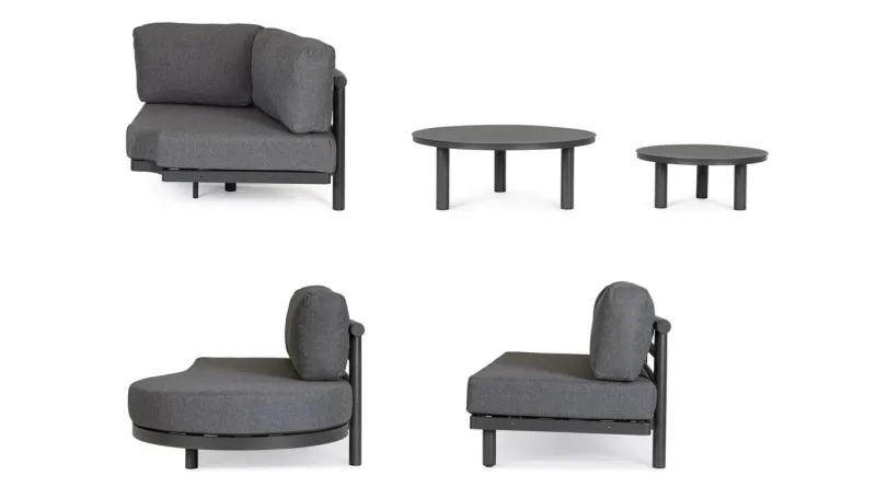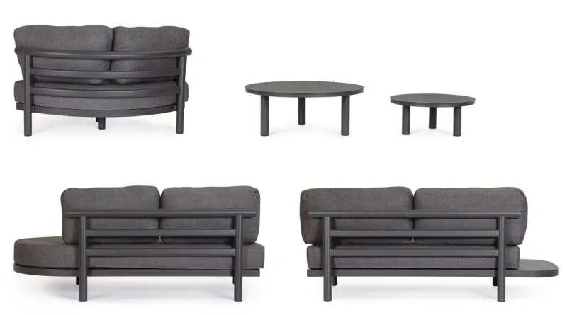 STRUTTURA IN ALLUMINIO VERNICIATO A POLVERE (POLIESTERE). CUSCINI SEDUTA E SCHIENALE SFODERABILI IN TESSUTO IDROREPELLENTE OLEFIN (100% POLIPROPILENE). PIEDINI REGOLABILI. GAMBE ANGOLARE E TAVOLINO (VITERIA IN ACCIAIO INOSSIDABILE) DA ASSEMBLARE.