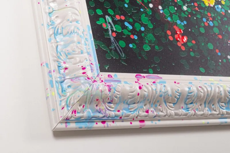 STAMPA SU TELA DIPINTA A MANO. STRUTTURA IN LEGNO DI ABETE. CORNICE IN PLASTICA.