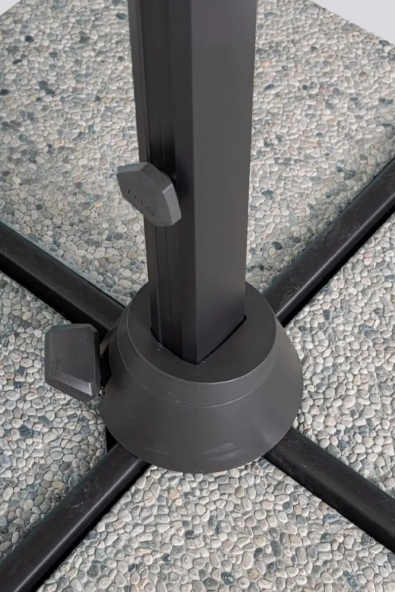 STRUTTURA IN ALLUMINIO VERNICIATA A POLVERE (POLIESTERE). PALO 55X82MM. 8 STECCHE 14.5X24MM. TELO GRIGIO CHIARO IN POLIESTERE 250GR/M2 CON RIVESTIMENTO IN PA (POLIAMMIDE) CON CAMINO ANTIVENTO. BASE A CROCE IN ACCIAIO. PALO GIREVOLE 360° CON PEDALINA. INCLINAZIONE VERTICALE CON IMPUGNATURA A 5 POSIZIONI. COMPRENSIVO DI COPRIOMBRELLONE. MARMETTE NON INCLUSE.