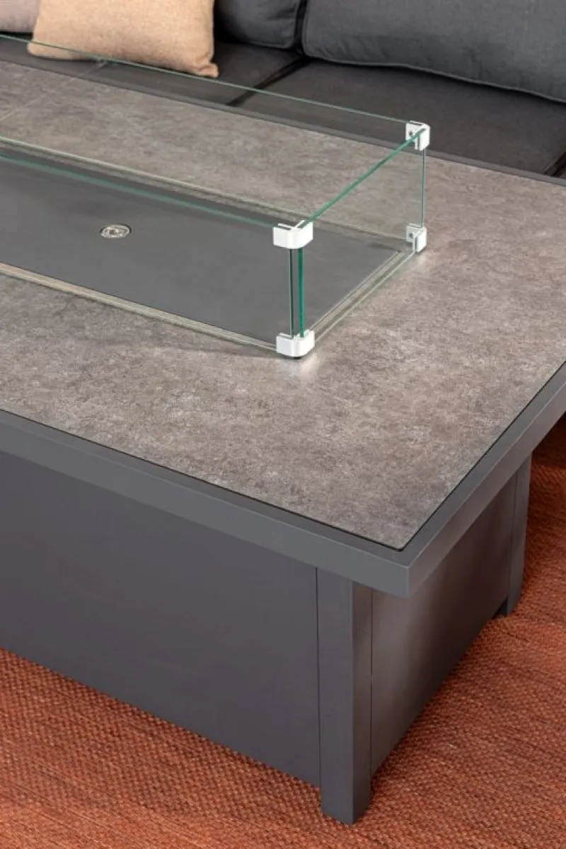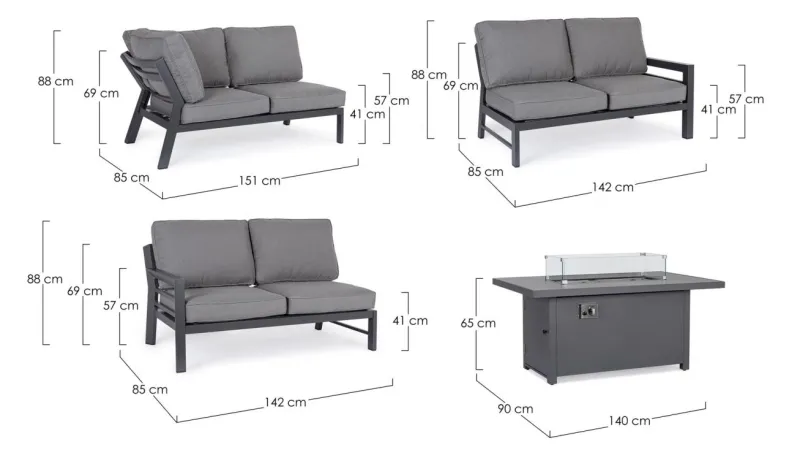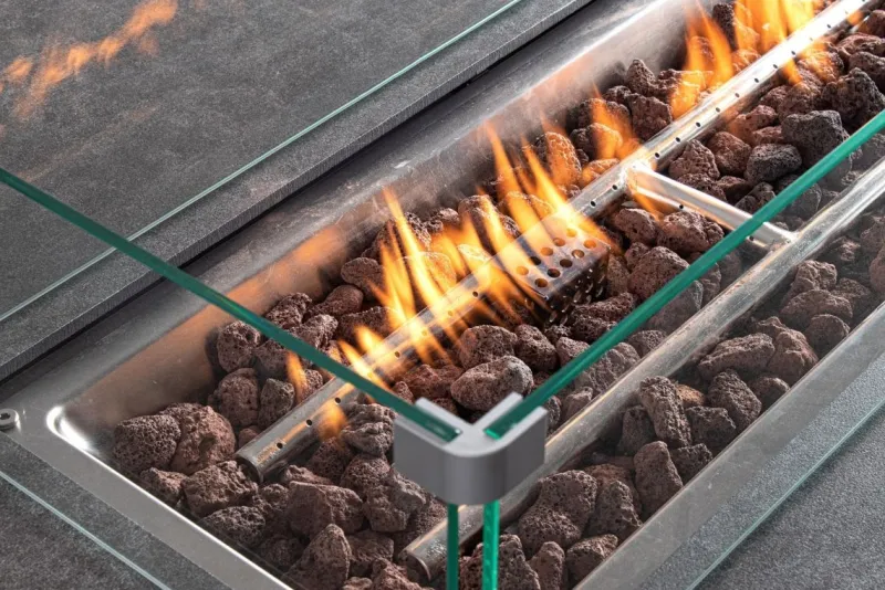 ALLUMINIO VERNICIATO A POLVERE (POLIESTERE). CUSCINI SFODERABILI CON TESSUTO IDROREPELLENTE 100% POLIESTERE. TAVOLO IN ALLUMINIO VERNICIATO A POLVERE (POLIESTERE) CON PIANO IN VETRO (SPESSORE 8MM) SERIGRAFATO EFFETTO CERAMICA E CAMINO CENTRALE A GAS. PARAVENTO PER CAMINO IN VETRO TEMPERATO E COPERCHIO IN ALLUMINIO. BRUCIATORE IN ACCIAIO INOSSIDABILE (#304). MANOPOLA DI