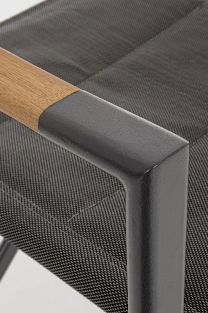 STRUTTURA IN ALLUMINIO, VERNICIATO A POLVERE (POLIESTERE). SEDUTA E SCHIENALE IN TEXTILENE 2X2 (680g/m2). BRACCIOLI CON INSERTI IN TEAK. FERRAMENTA IN ACCIAIO INOSSIDABILE. PIEGHEVOLE.