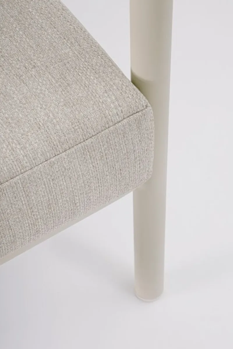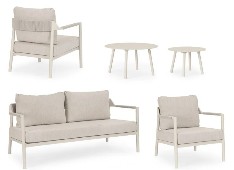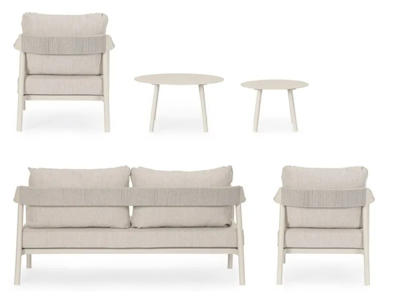 STRUTTURA IN ALLUMINIO VERNICIATO A POLVERE (POLIESTERE). SCHIENALI E BRACCIOLI CON INTRECCIO IN CORDE DI POLIESTERE. CUSCINI SEDUTA E SCHIENALE SFODERABILI CON TESSUTO IDROREPELLENTE OLEFIN (100% POLIPROPILENE).