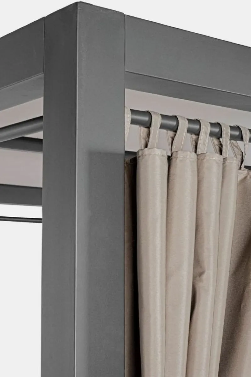 STRUTTURA IN ALLUMINIO VERNICIATO A POLVERE. PALI 80X80MM. TELO TETTUCCIO E CUSCINI SEDUTA (SFODERABILI) IN TEXTILENE 1X1, IMBOTTITURA PER ESTERNO FAST DRY FOAM. SCHIENALI RECLINABILI IN 4 POSIZIONI. TENDE LATERALI IN POLIESTERE. DA ASSEMBLARE.