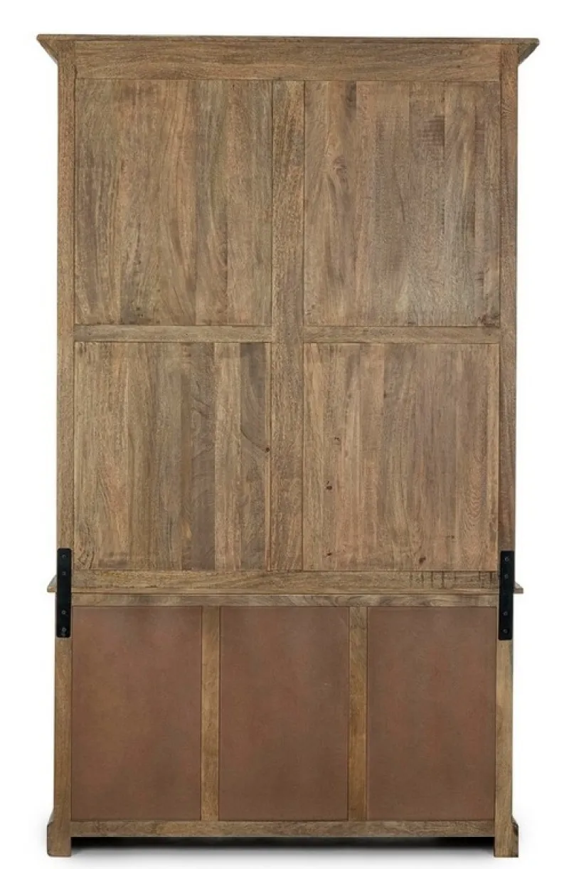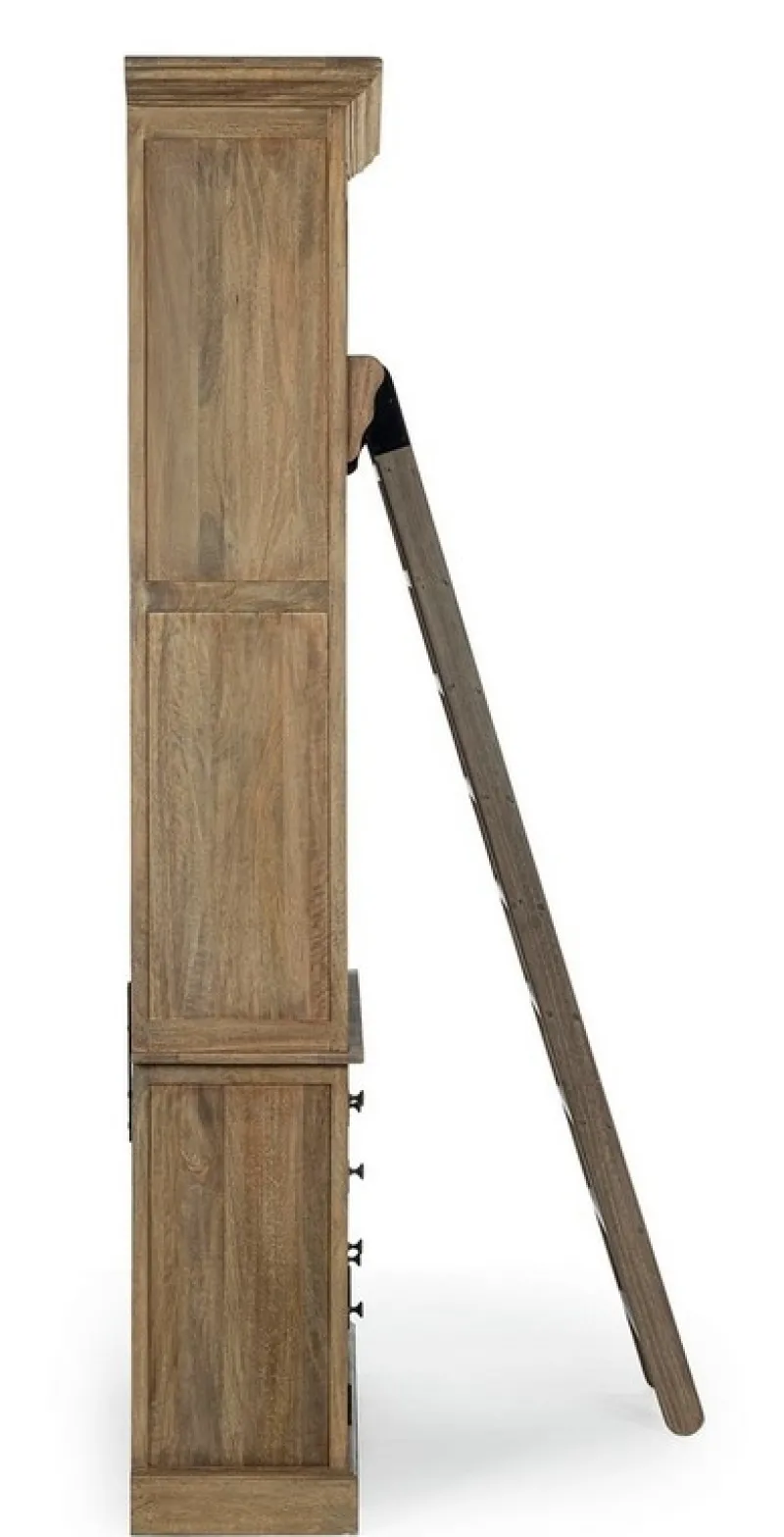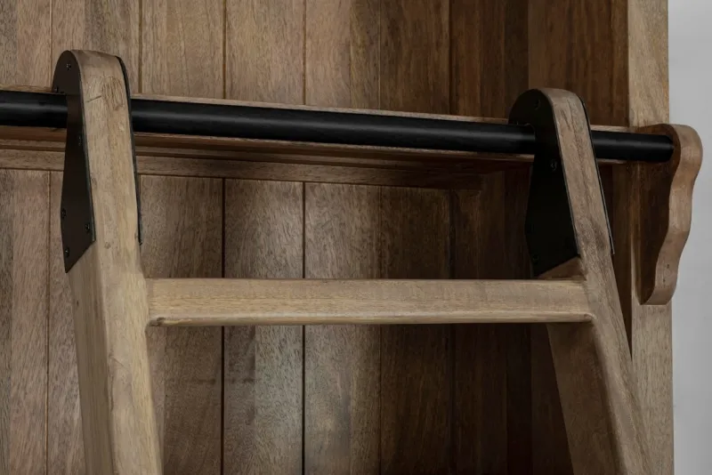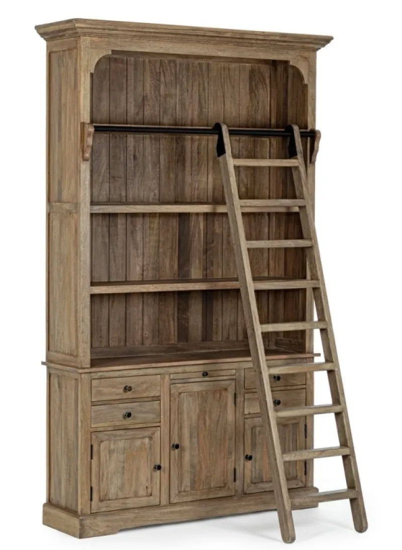 STRUTTURA IN LEGNO DI MANGO, SCHIENALE E FONDO CASSETTI IN MDF. SCALA DECORATIVA IN MANGO, BARRA REGGI SCALA IN ACCIAIO. FINITURA CON VERNICE A BASE D’ACQUA. MANIGLIE IN GHISA.