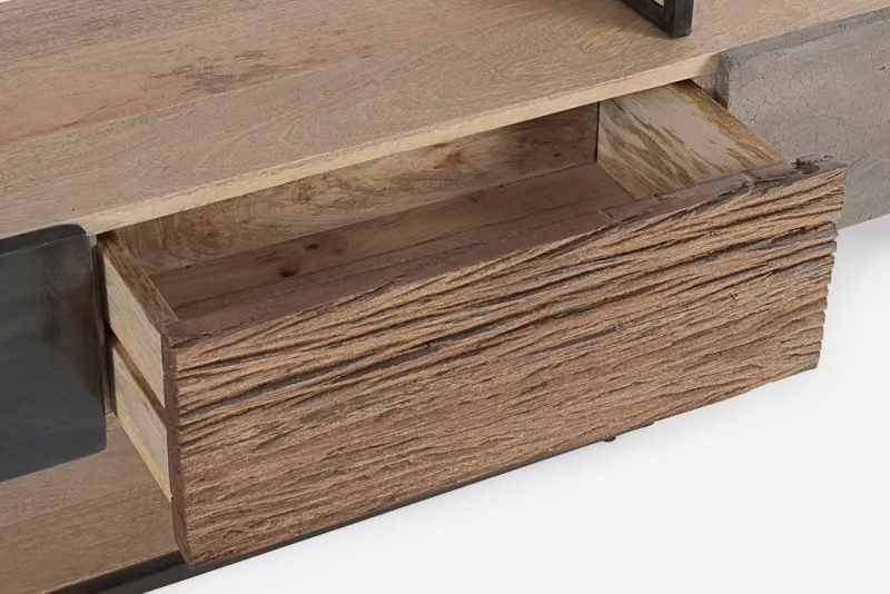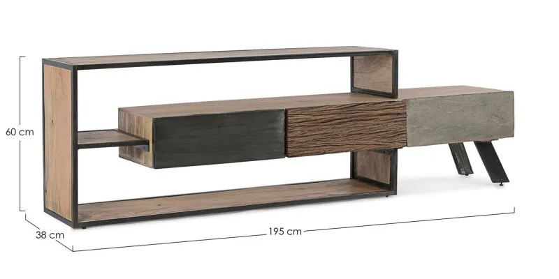STRUTTURA IN LEGNO MANGO ED ACCIAIO, SCHIENALE IN COMPENSATO. FRONTALE ANTE E CASSETTI IN LEGNO RICICLATO O LAMINA DI ACCIAIO O FINITURA IN FIBRA DI CEMENTO. FINITURA ACRILICA PROTETTIVA. PIEDINI REGOLABILI. IL PRODOTTO IN LEGNO RICICLATO È CARATTERIZZATO DALLA PRESENZA DI TASSELLI IN LEGNO DI DIVERSE SPECIE E COLORE. EVENTUALI FESSURE, CREPE O IMPERFEZIONI, CHE POSSONO