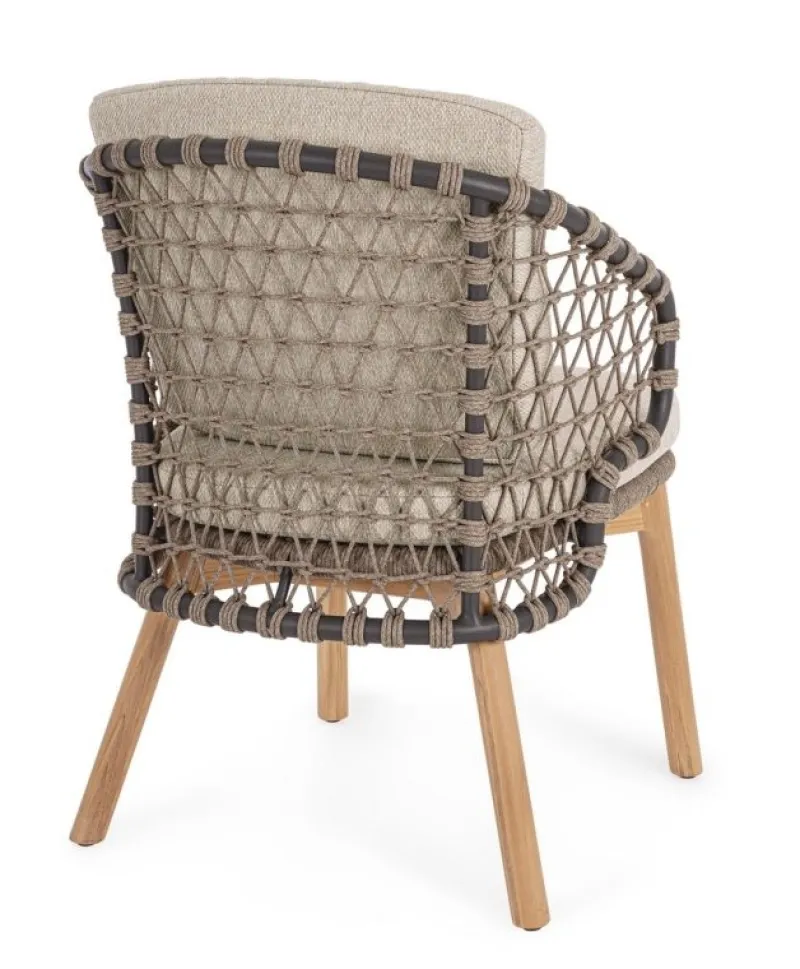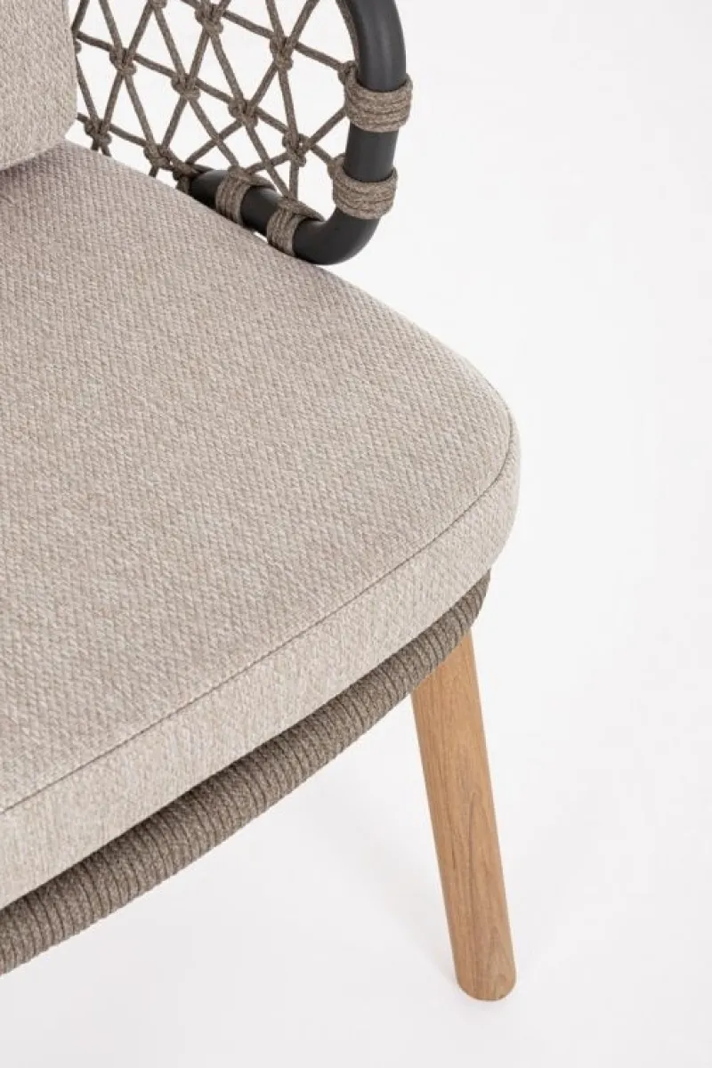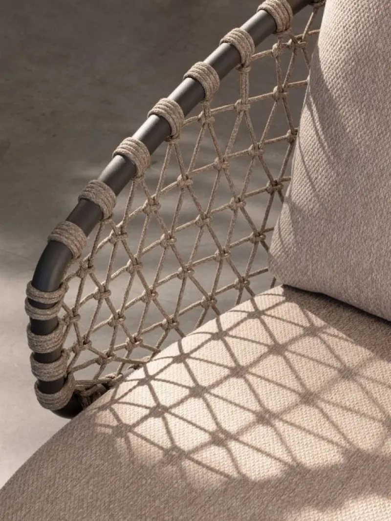 STRUTTURA IN ALLUMINIO VERNICIATA A POLVERE (POLIESTERE). GAMBE IN TEAK – SVLK (LEGNO CERTIFICATO PROVENIENTE DA FORESTE SOSTENIBILI). INTRECCIO PER ESTERNO IN CORDA (POLIPROPILENE). CUSCINI SFODERABILI IN TESSUTO IDROREPELLENTE SUNPROOF OLEFIN (100%POLYPROPYLENE). VITERIA IN ACCIAIO INOSSIDABILE. GAMBE DA ASSEMBLARE.