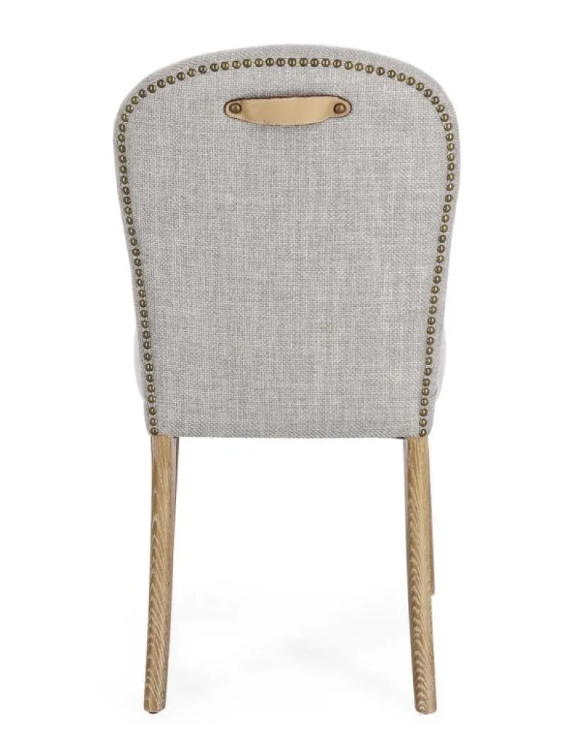 STRUTTURA IN LEGNO DI FRASSINO, RIVESTIMENTO IN POLIESTERE. SCHIENALE CON APPLICAZIONE DI BORCHIE IN METALLO E MANIGLIA IN SIMILPELLE. DENSITA’ IMBOTTITURA IN SCHIUMA POLIURETANICA SEDUTA 30KG/M3, SCHIENALE 25KG/M3.