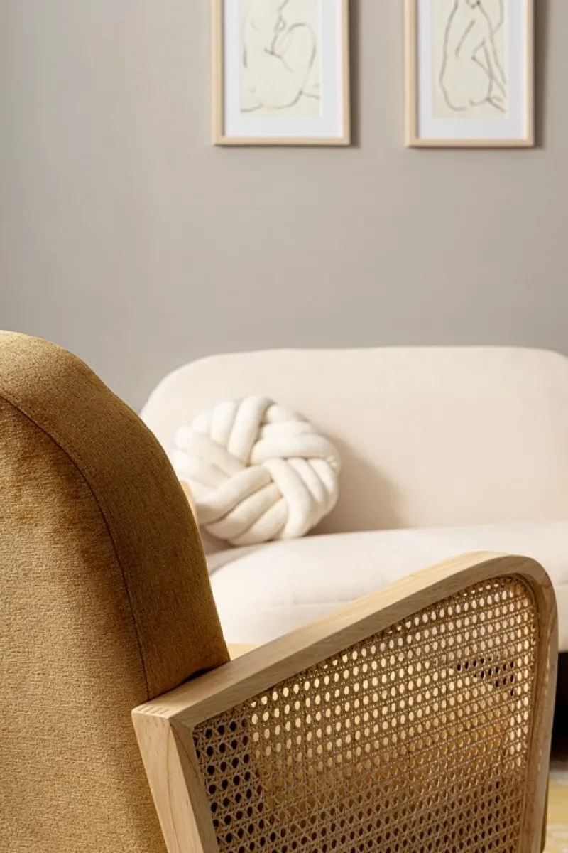 STRUTTURA IN LEGNO DI PINO E COMPENSATO. GAMBE IN RUBBERWOOD. BRACCIOLI CON INSERTI IN RATTAN. RIVESTIMENTO IN POLIESTERE. DENSITA’ IMBOTTITURA IN SCHIUMA POLIURETANICA 24 KG/M3. NON SFODERABILE. GAMBE DA ASSEMBLARE.
