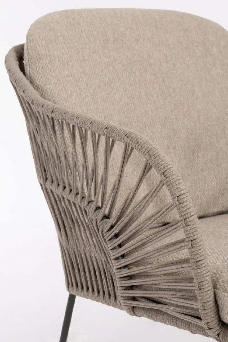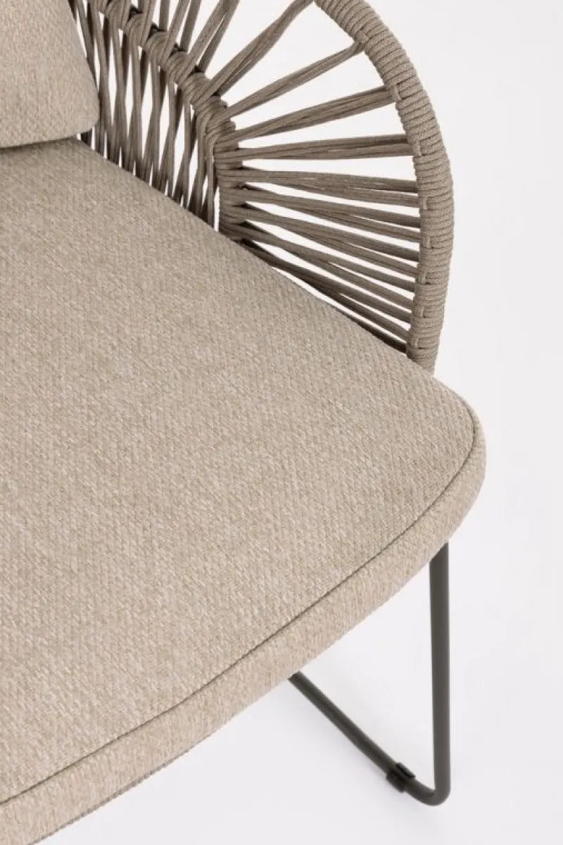 STRUTTURA IN ACCIAIO INOSSIDABILE (201). INTRECCIO PER ESTERNO IN CORDA (POLIPROPILENE). CUSCINI SFODERABILI IN TESSUTO IDROREPELLENTE SUNPROOF OLEFIN (100%POLYPROPYLENE).
