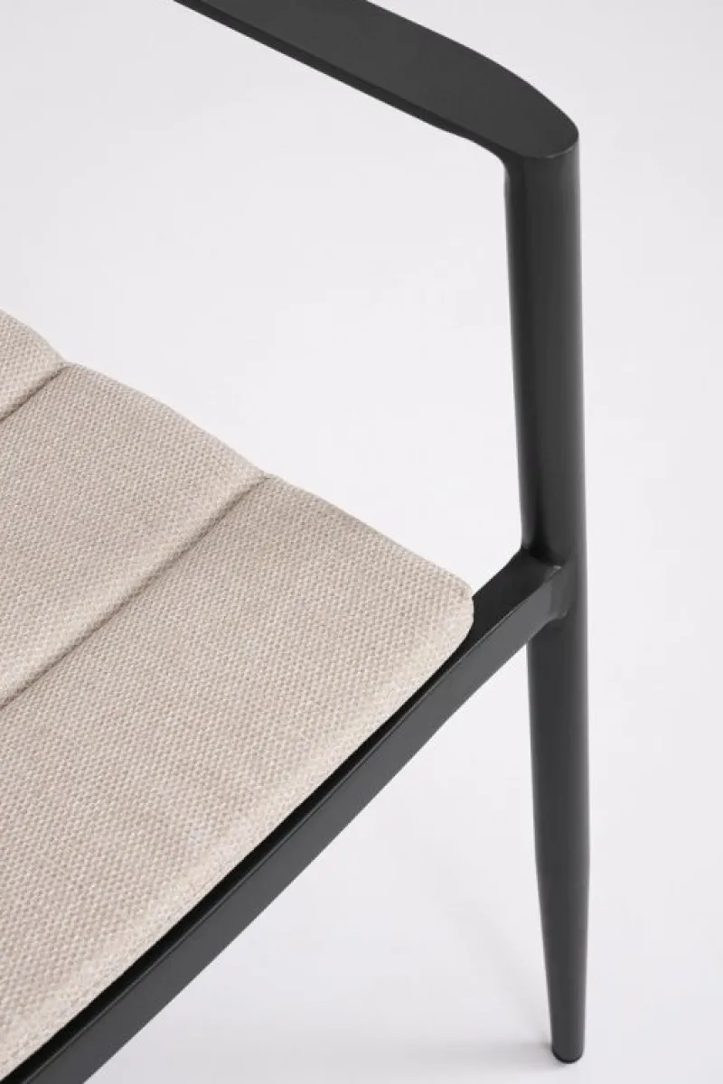STRUTTURA IN ALLUMINIO VERNICIATO A POLVERE (POLIESTERE). CUSCINO SEDUTA NON SFODERABILE CON TESSUTO IDROREPELLENTE OLEFIN (100% POLIPROPILENE). IMPILABILE.