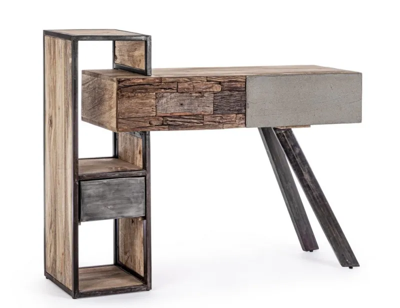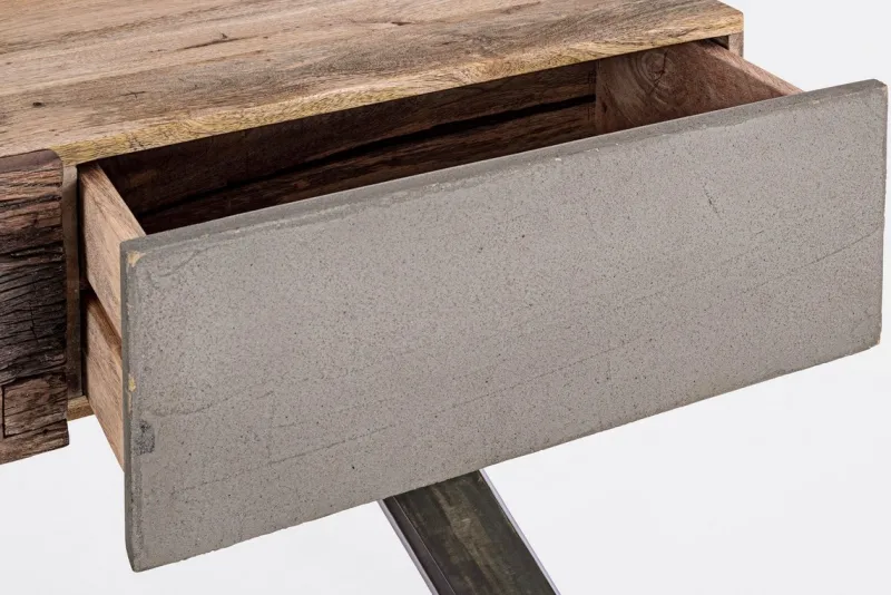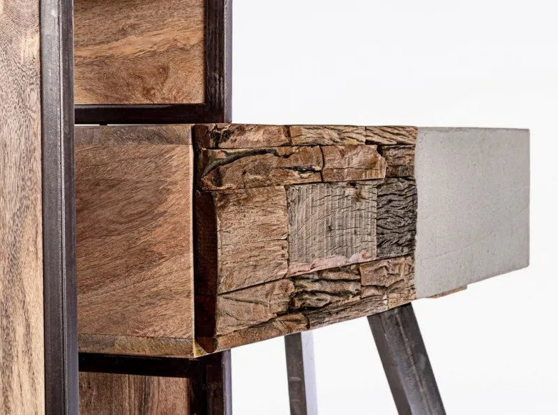STRUTTURA IN LEGNO MANGO ED ACCIAIO, SCHIENALE IN COMPENSATO. FRONTALE ANTE E CASSETTI IN LEGNO RICICLATO O LAMINA DI ACCIAIO O FINITURA IN FIBRA DI CEMENTO. FINITURA ACRILICA PROTETTIVA. PIEDINI REGOLABILI. IL PRODOTTO IN LEGNO RICICLATO È CARATTERIZZATO DALLA PRESENZA DI TASSELLI IN LEGNO DI DIVERSE SPECIE E COLORE. EVENTUALI FESSURE, CREPE O IMPERFEZIONI, CHE POSSONO