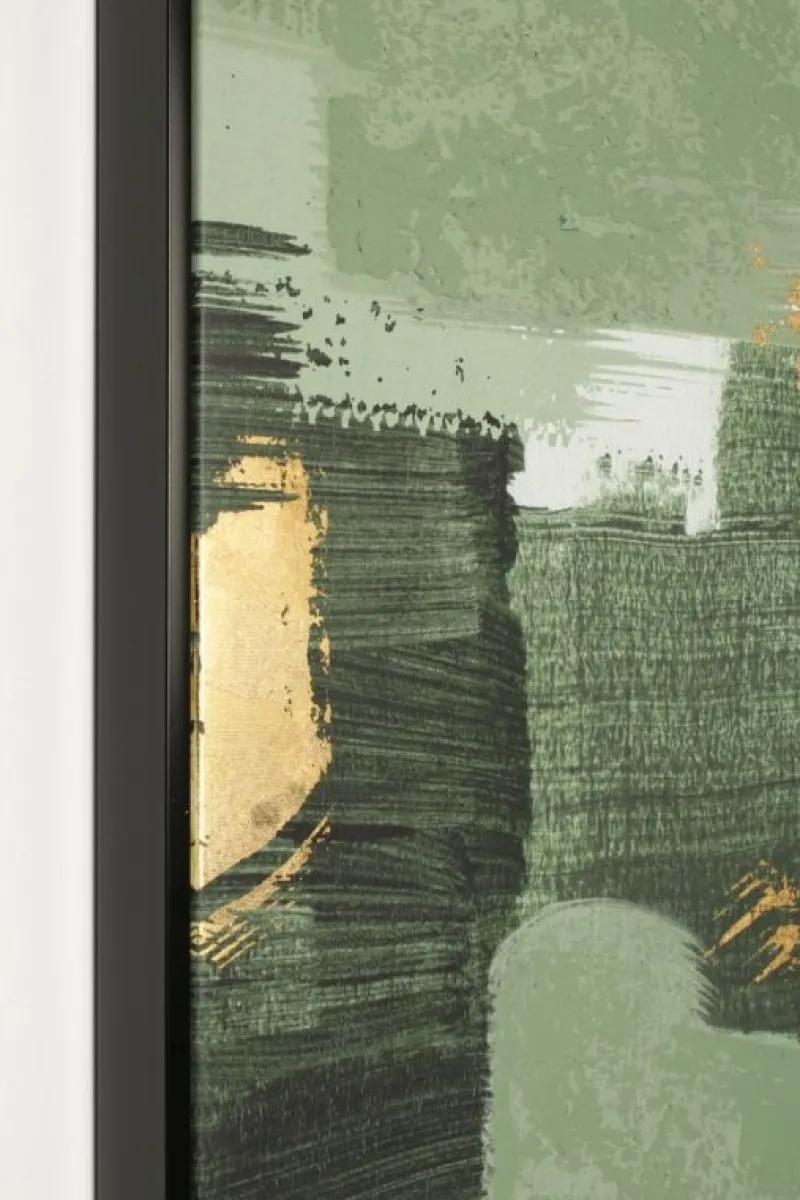 STAMPA SU TELA DIPINTA A MANO CON APPLICAZIONI FOGLI DORATI. CORNICE IN MDF.