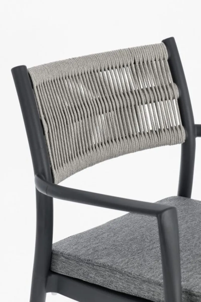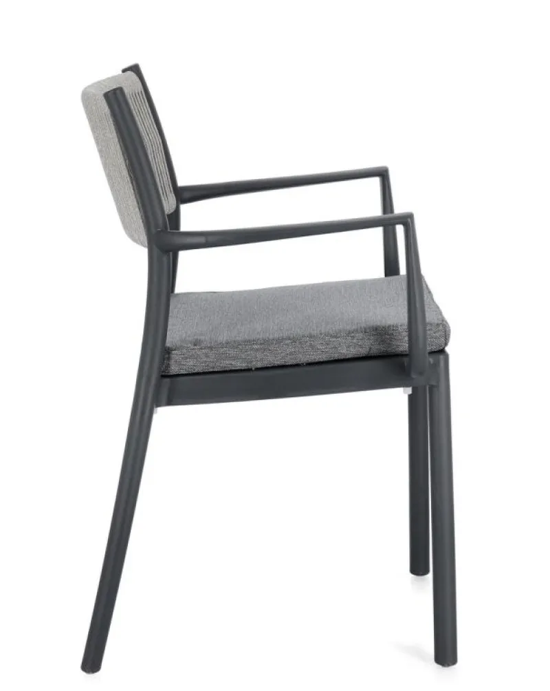 POLIPROPILENE (PP), RESISTENTE AI RAGGI UV. SCHIENALE CON INTRECCIO IN CORDA DI POLIESTERE. CUSCINO SEDUTA SFODERABILE CON TESSUTO IDROREPELLENTE POLIESTERE. IMPILABILE.