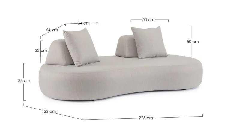 - MisureDIVANO: 225a – 123b – 38h SCHIENALE MEZZALUNA: 64a – 34b – 32h CUSCINO: 50×50Scarica la legenda delle misure