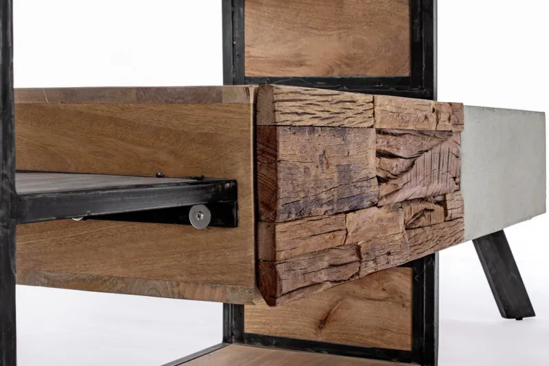 STRUTTURA IN LEGNO MANGO ED ACCIAIO, SCHIENALE IN COMPENSATO. FRONTALE ANTE E CASSETTI IN LEGNO RICICLATO O LAMINA DI ACCIAIO O FINITURA IN FIBRA DI CEMENTO. FINITURA ACRILICA PROTETTIVA. PIEDINI REGOLABILI. IL PRODOTTO IN LEGNO RICICLATO È CARATTERIZZATO DALLA PRESENZA DI TASSELLI IN LEGNO DI DIVERSE SPECIE E COLORE. EVENTUALI FESSURE, CREPE O IMPERFEZIONI, CHE POSSONO