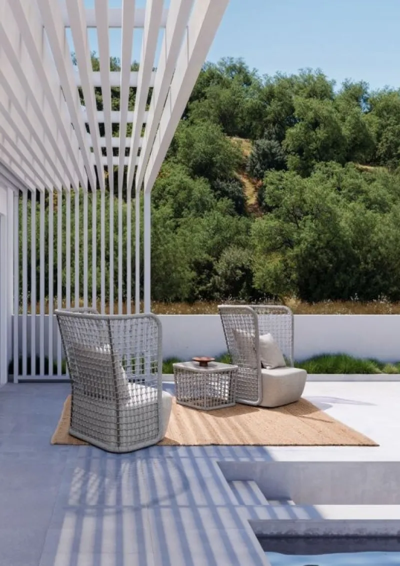 STRUTTURA IN ALLUMINIO VERNICIATO A POLVERE (POLIESTERE). INTRECCIO IN CORDA OLEFIN (100% POLIPROPILENE). SEDUTA CON IMBOTTITURA IMPERMEABILE, RIVESTIMENTO NON SFODERABILE IN TESSUTO PER ESTERNO OLEFIN (100% POLIPROPILENE) IDROREPELLENTE E RESISTENTE AI RAGGI UV (GRADO 7). CUSCINO SCHIENALE SFODERABILE IN TESSUTO IDROREPELLENTE OLEFIN (100% POLIPROPILENE).